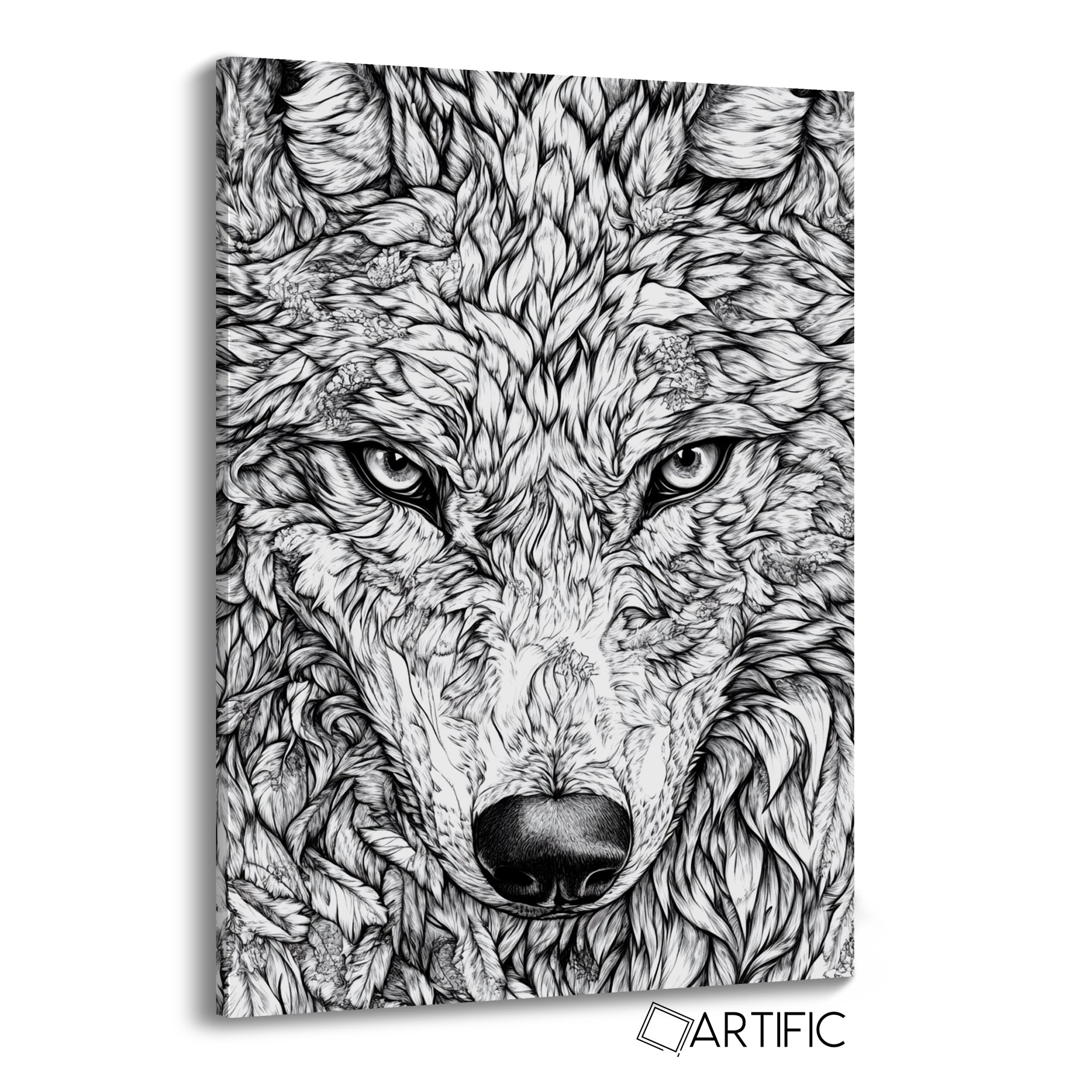 Esta obra presenta un retrato en blanco y negro de un lobo con un enfoque en la intrincada textura de su pelaje. Las líneas y sombras detalladas crean un efecto de movimiento y realismo que resalta la intensidad en los ojos del lobo. El estilo es similar al arte ilustrativo, con un toque elegante y clásico en su composición vertical.