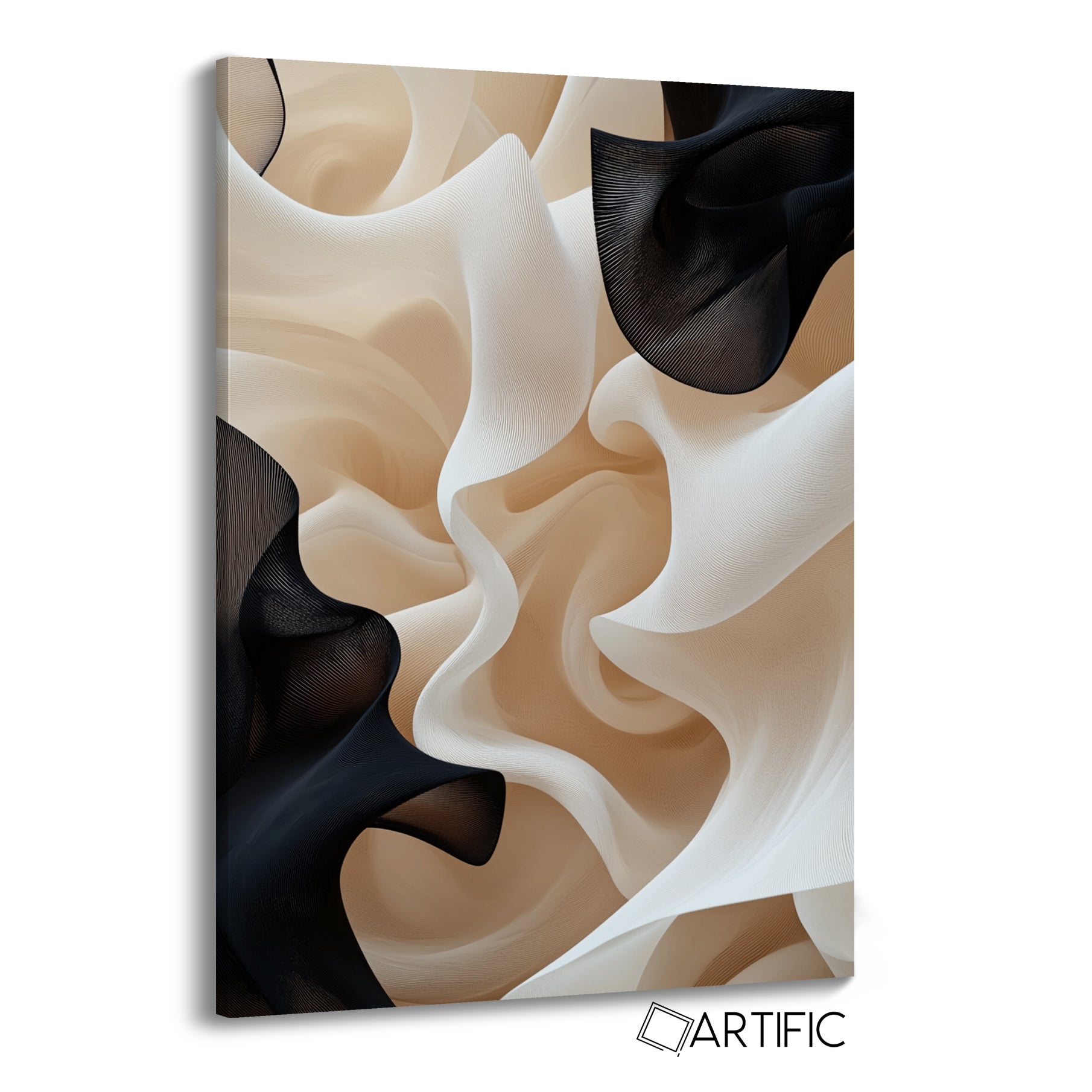 Esta impresionante obra de arte abstracto presenta suaves ondulaciones en tonos beige, blanco y negro. Las formas fluidas se entrelazan, creando una danza visual de colores y texturas que evocan una sensación de movimiento y serenidad. La composición destaca por su elegancia y los sutiles matices de los tonos oscuros contrastan maravillosamente sobre el fondo claro.
