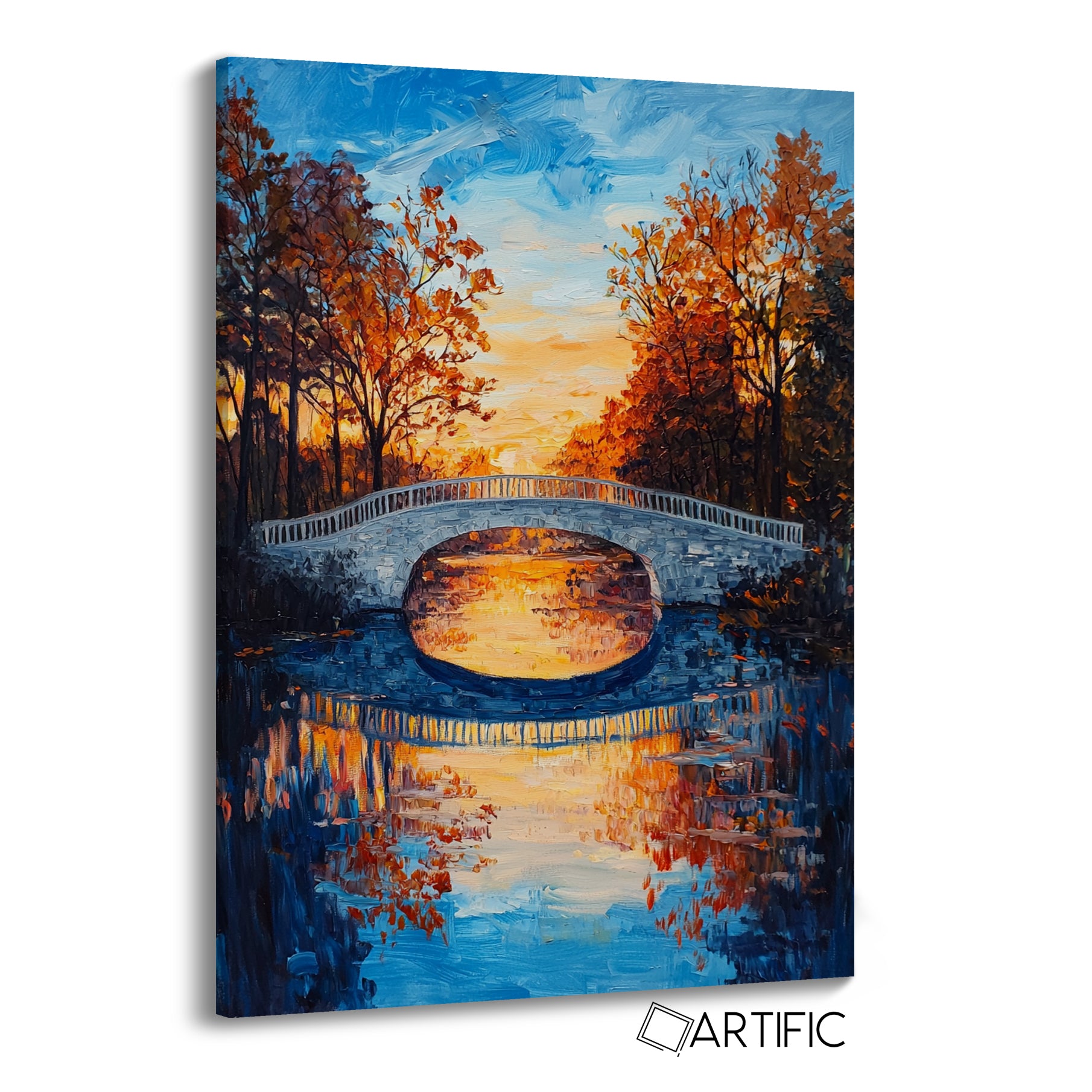 Esta obra maestra representa un sereno atardecer en otoño sobre un puente pintado al óleo. Los vibrantes tonos naranjas y azules se complementan con el detallado reflejo en el agua, capturando la esencia del cambio de estación. La textura de las pinceladas y la simetría del puente añaden profundidad y elegancia a la composición.