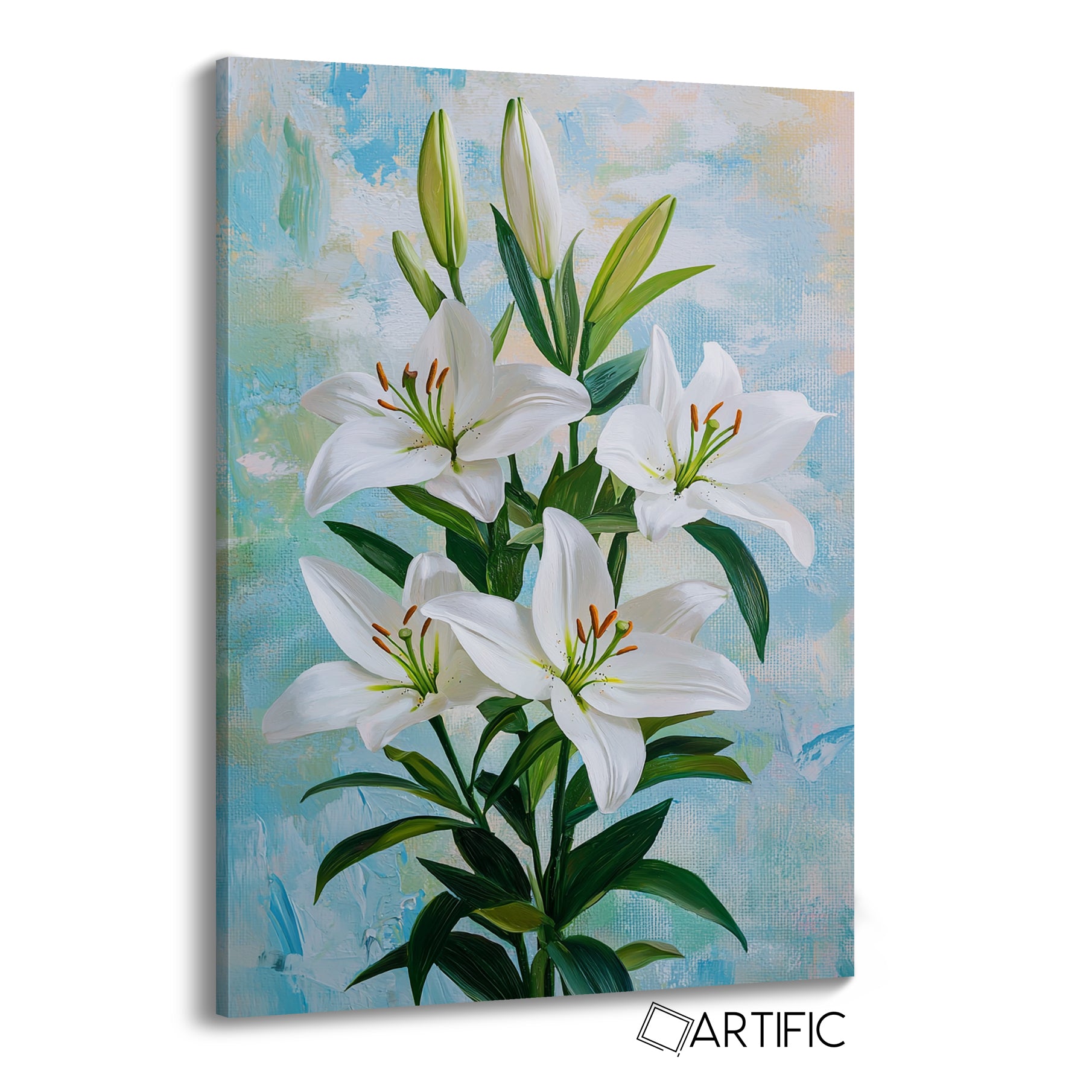 Esta impresionante obra muestra lirios blancos en un estilo que recuerda a una pintura al óleo. Las flores están delicadamente detalladas con pétalos blancos puros y estambres anaranjados, contrastando maravillosamente con las hojas verdes. El fondo presenta tonos suaves de azul y amarillo pastel que complementan la elegante composición, capturando una esencia calmante y artística.