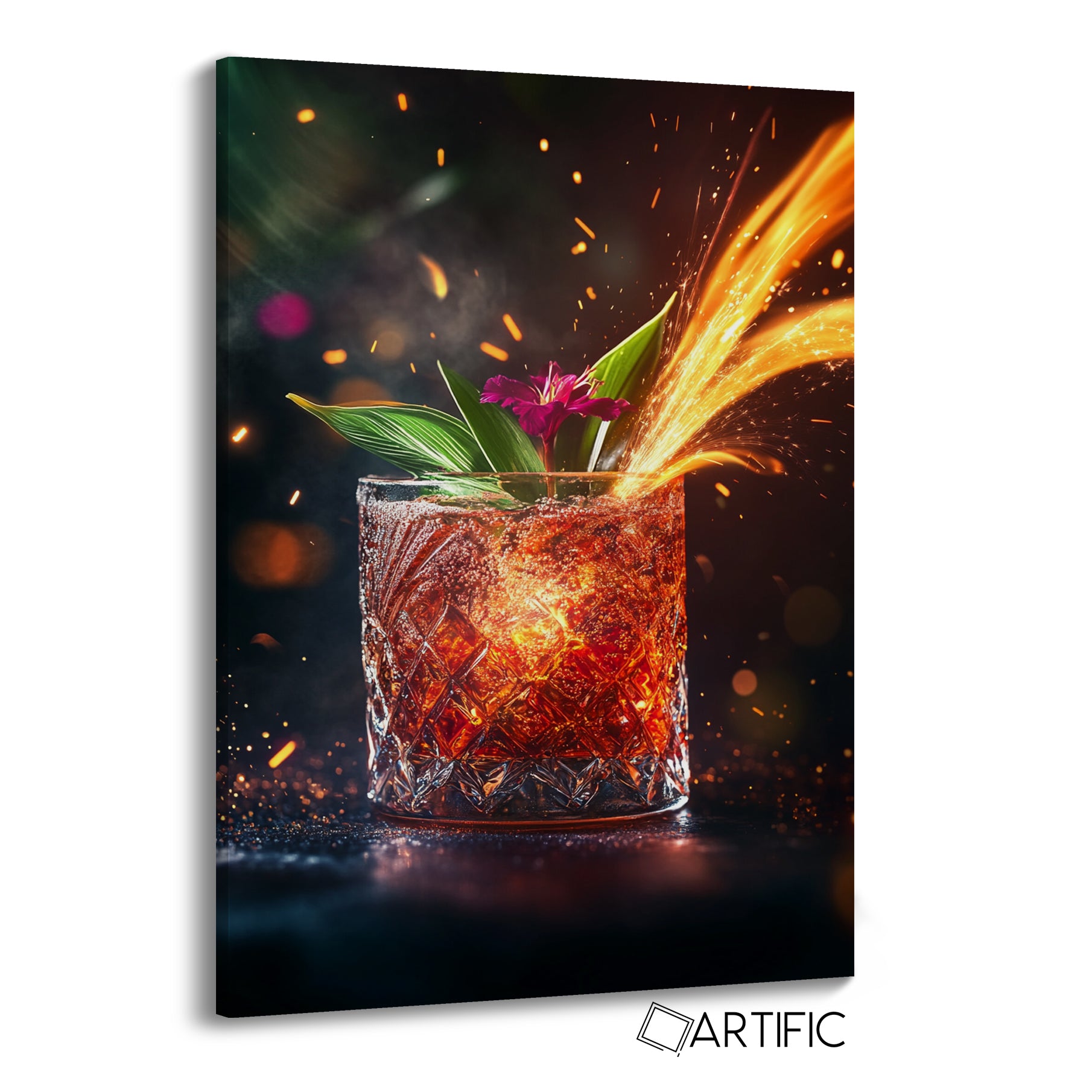 Esta imagen impresionante muestra un cóctel en un vaso tallado con detalles exquisitos. El centro se ve vibrante con su líquido rojo intenso, destacando una flor magenta y hojas verdes en la parte superior. Salpicaduras y chispas naranja brillante emergen dramáticamente, creando un efecto de explosión de fuego. El fondo oscuro resalta los tonos vibrantes y la composición elegante.
