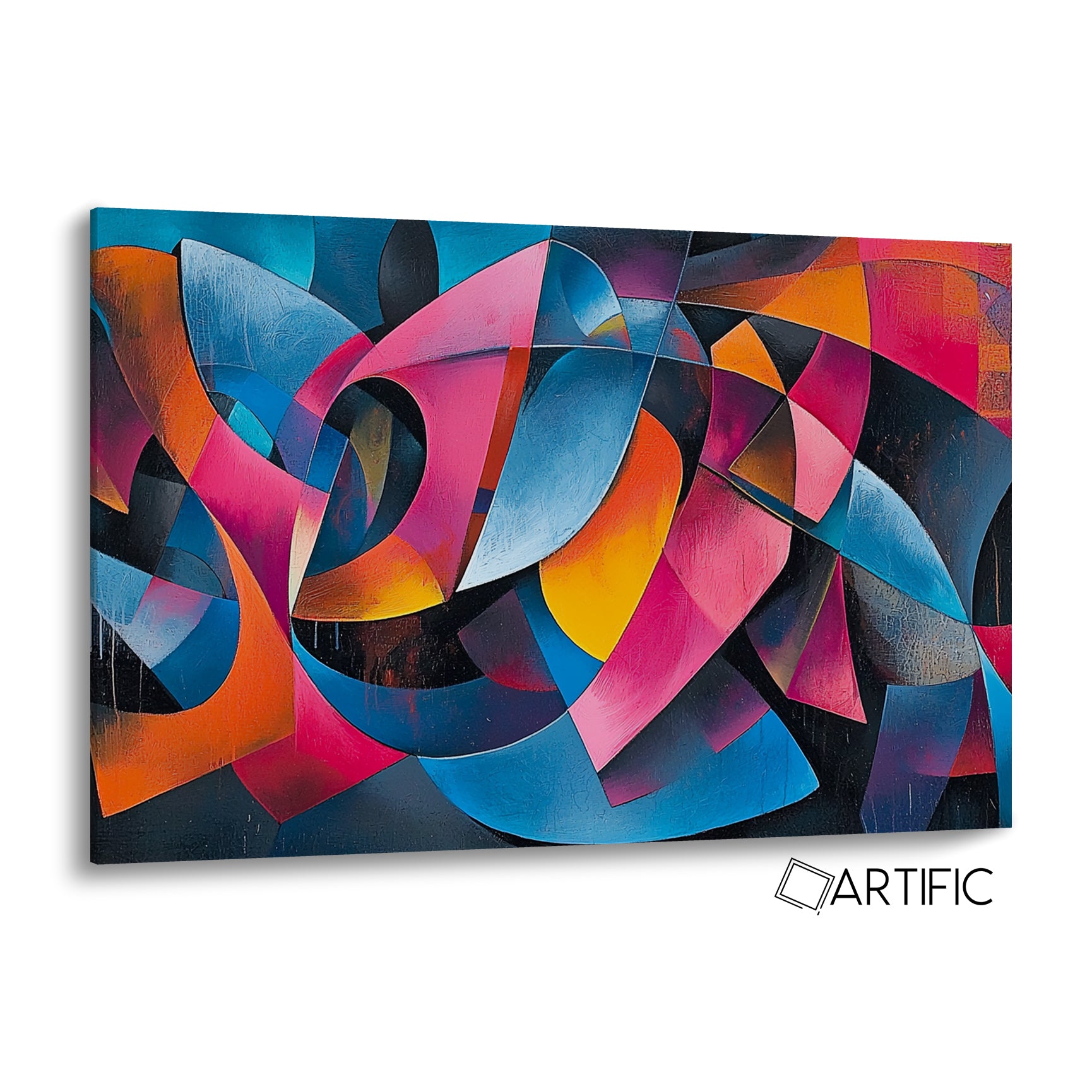 Esta obra de arte abstracta presenta una explosión de formas curvas y colores intensos. Dominan tonos vibrantes de azul, rosa, naranja y amarillo, que se entrelazan en un dinámico juego de capas. La composición recuerda a una pintura al óleo por su textura rica y profundidad de color, evocando un sentido de movimiento y energía. La orientación horizontal de la obra y su complejidad visual transforman cualquier espacio en un testimonio de expresión artística moderna.