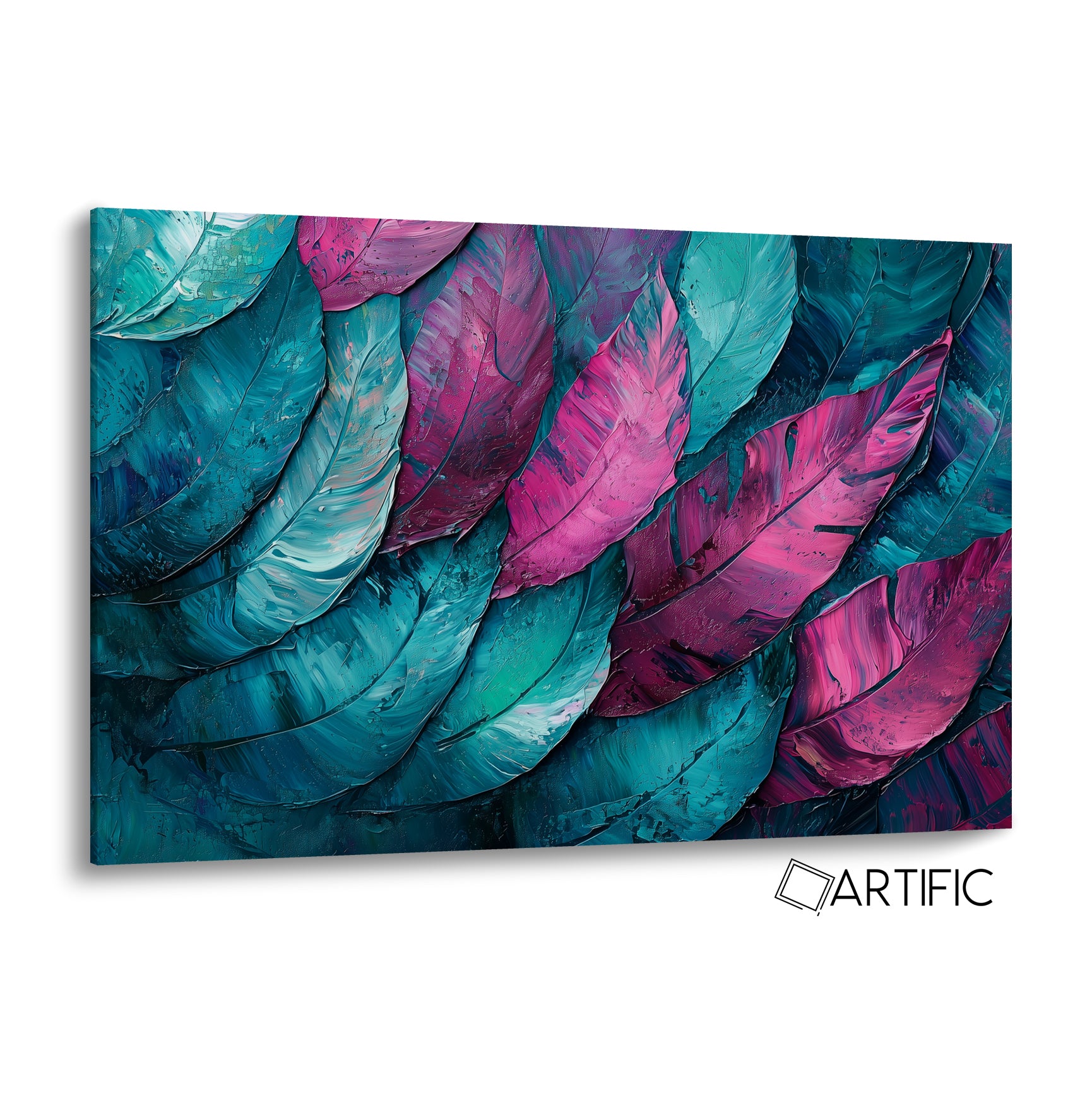 Una impresionante obra de arte que combina tonos vibrantes de azul y rosa en forma de hojas abstractas, evocando la textura rica de una pintura al óleo. La composición se despliega en un formato horizontal, resaltando la delicadeza y el dinamismo del diseño.