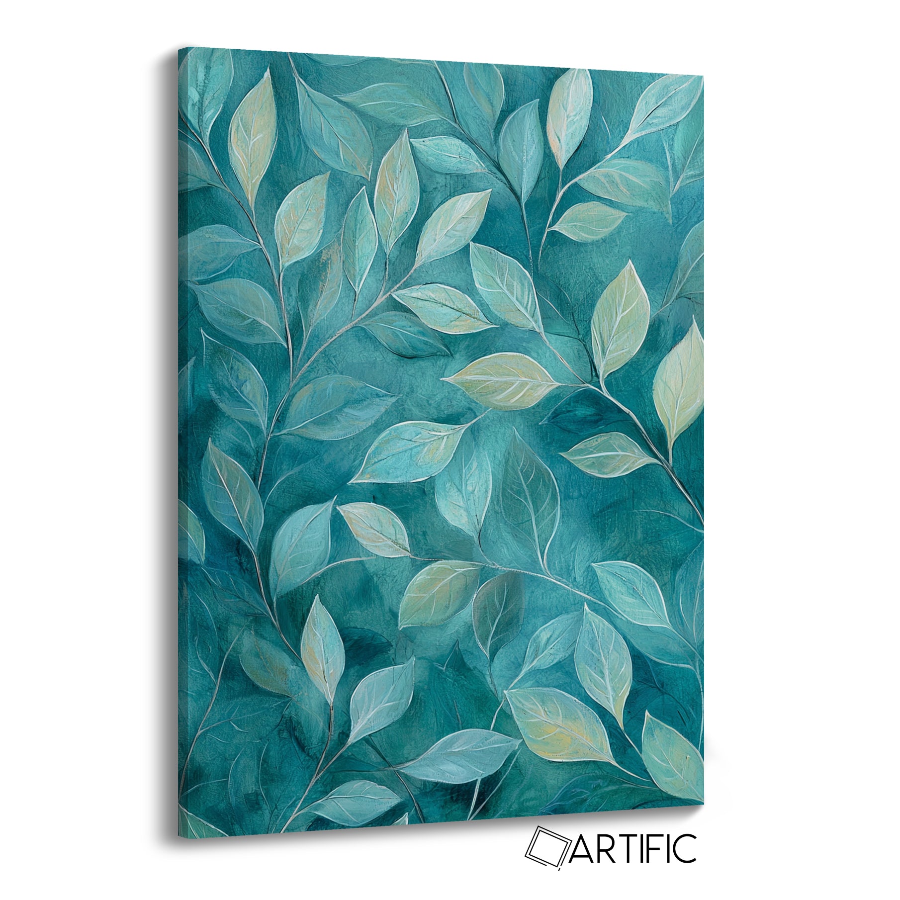 Esta obra presenta un diseño artístico con hojas estilizadas sobre un fondo en tonos de azul y turquesa. Las hojas están detalladamente delineadas, resaltando con colores vibrantes y creando una sensación de movimiento natural. El estilo recuerda una pintura al óleo con texturas que aportan profundidad y elegancia.