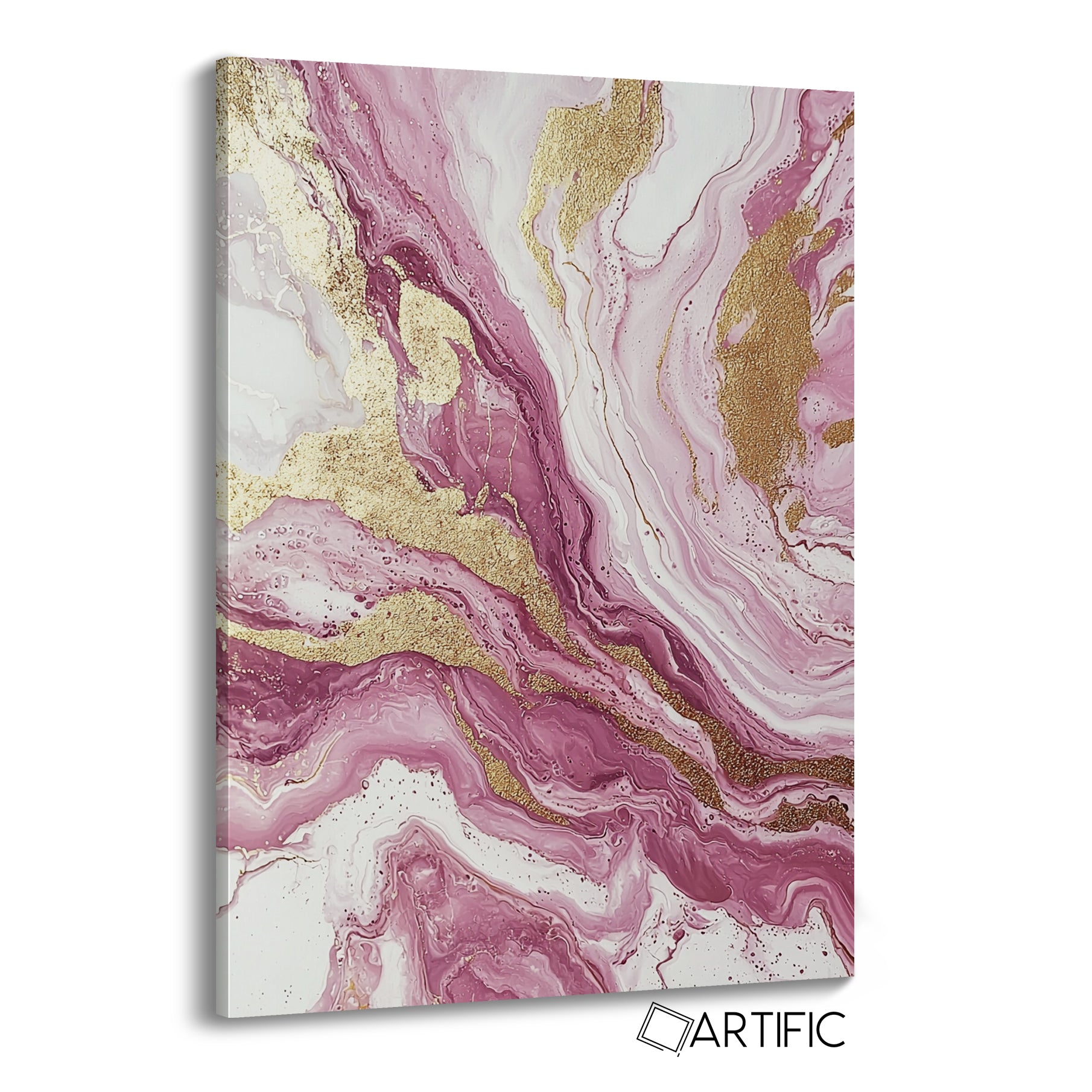 Una obra artística que combina la fluidez del arte abstracto con la sofisticación de los tonos dorados y rosados. La pintura presenta remolinos de color rosa y blanco que se mezclan con elegantes toques de dorado, creando una sensación de lujo y movimiento.