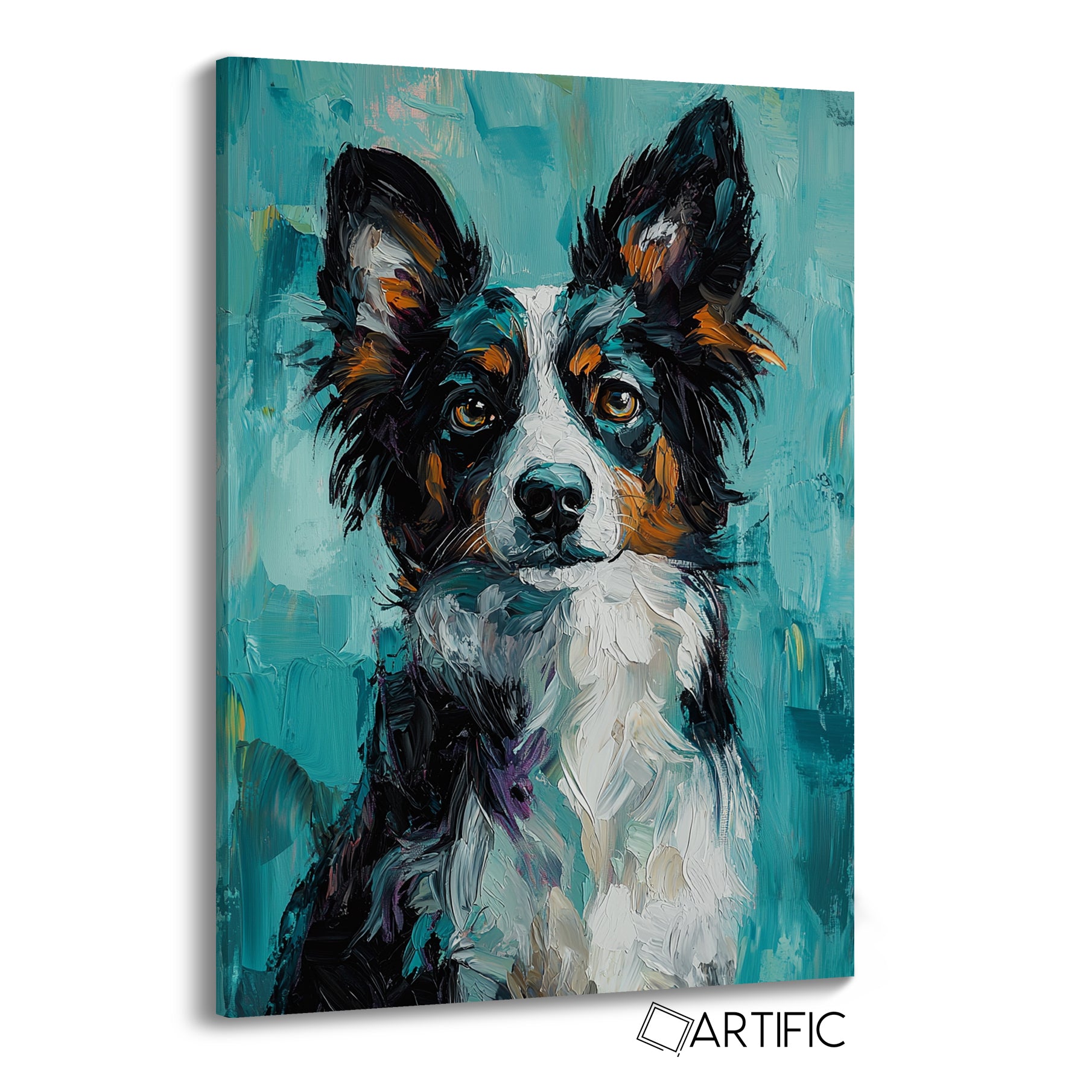 Este retrato en pintura al óleo de un perro captura su mirada penetrante y nobleza. Predominan los tonos azules y turquesas, complementados con detalles en negro, marrón y blanco. La textura densa de las pinceladas se suma a la profundidad y expresividad del retrato, aportando un sentimiento vibrante y realista. La composición vertical enfoca la atención en el rostro del perro, resaltando su expresividad y los matices del pelaje.