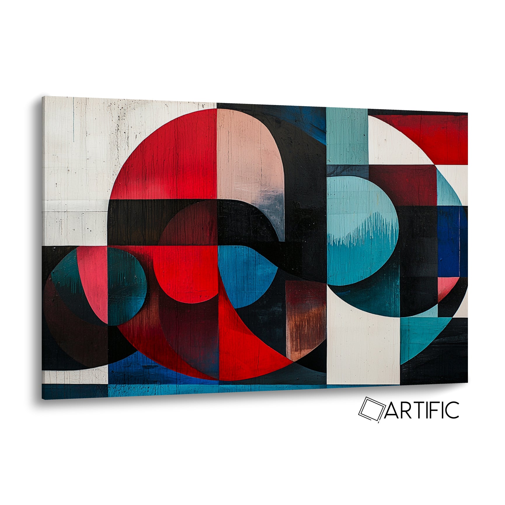 Esta composición abstracta resalta con formas geométricas interconectadas, dominadas por vibrantes tonos de rojo, azul y negro. El juego de colores y texturas hace que cada sección de la obra sea un espectáculo visual, evocando el estilo de una pintura al óleo moderna, llena de movimiento y energía.