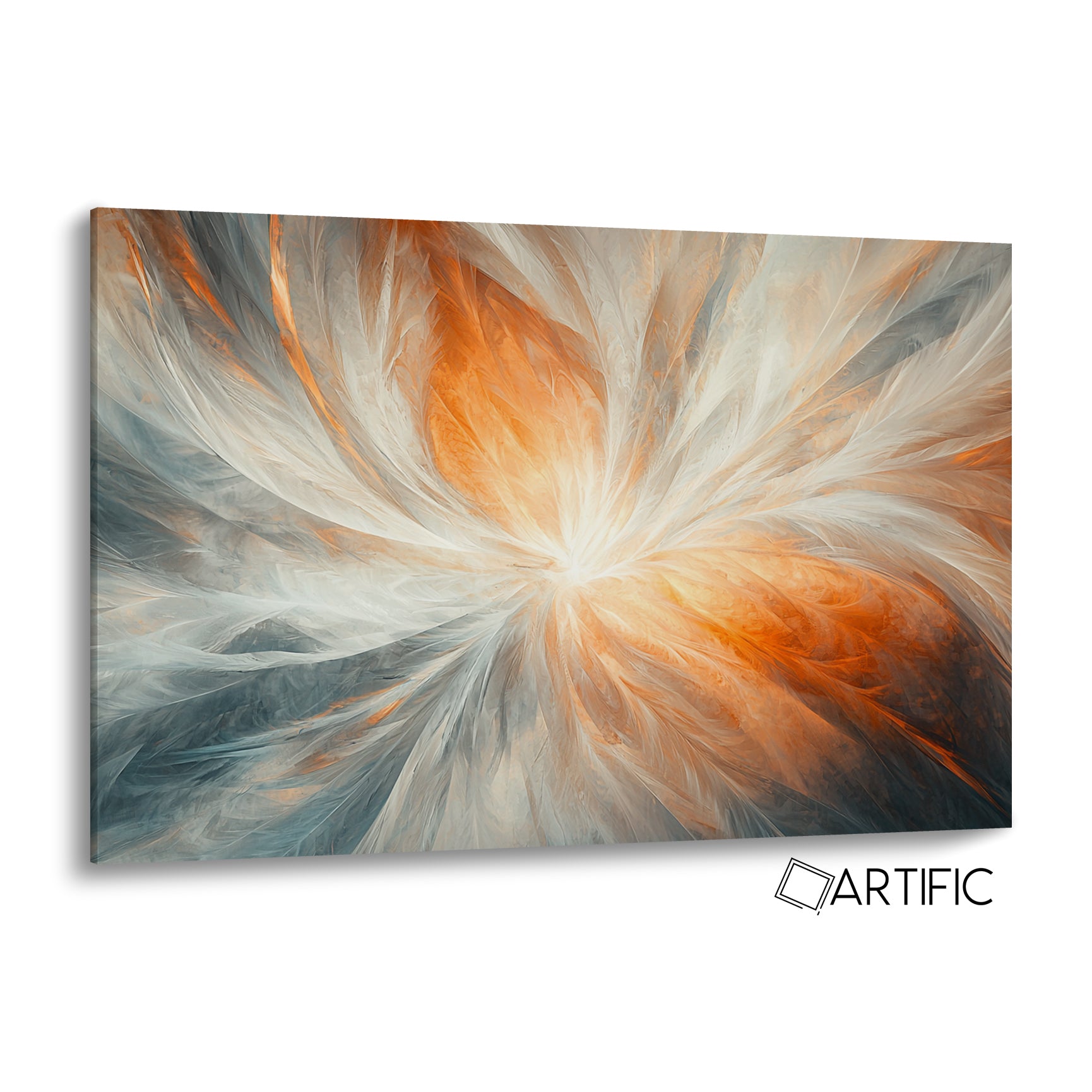 Esta obra destaca por sus vibrantes colores en tonos cálidos y fríos que simulan una explosión luminosa, con texturas similares a plumas u hojas. Predominan los tonos naranjas, crema y grises en una fusión armónica que evoca movimiento y energía. La composición se centra en un punto de luz blanca que irradia hacia los bordes, creando un efecto visual cautivador.