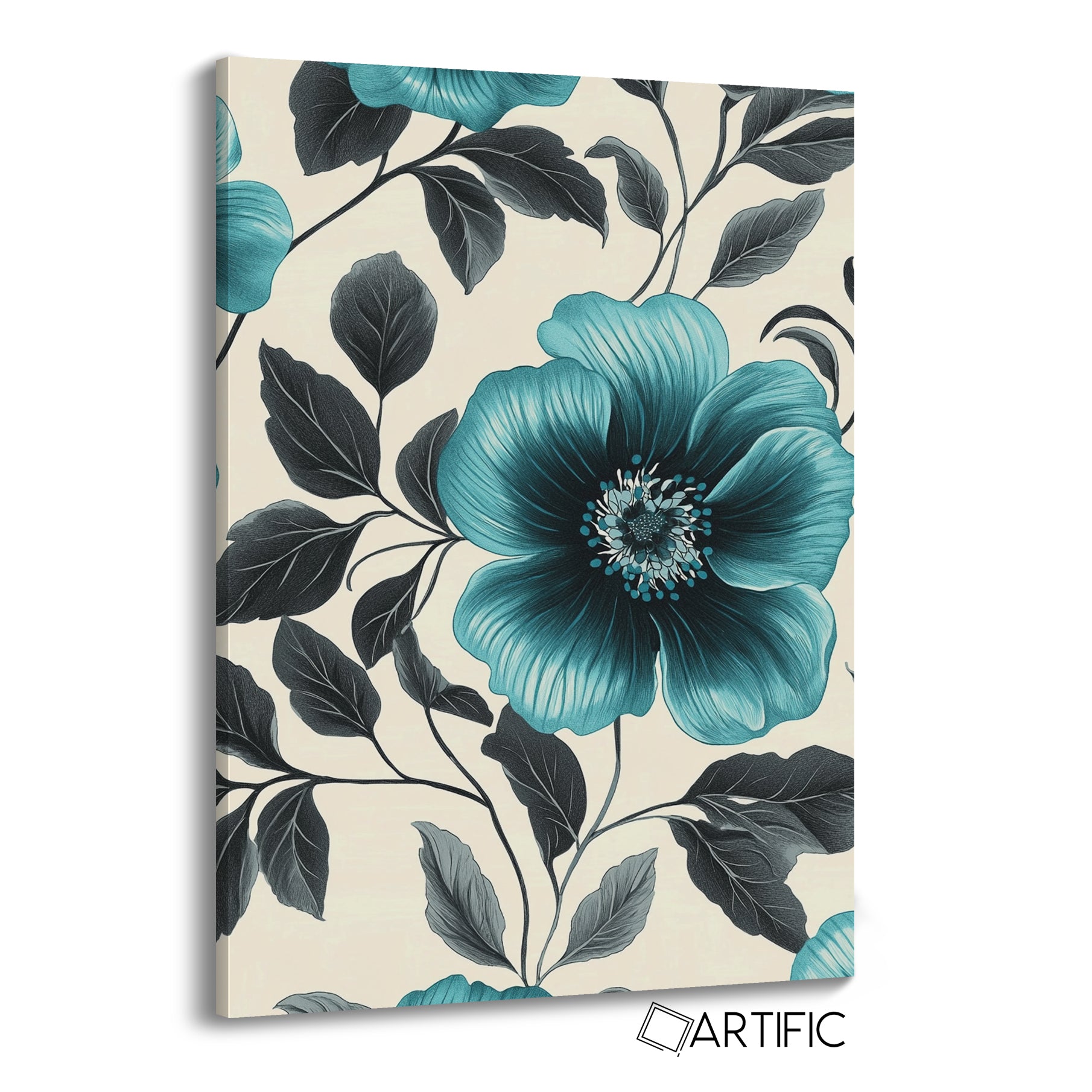 Este diseño elegante presenta grandes flores azules sobre un fondo claro, ofreciendo un aire de serenidad y sofisticación. Las hojas en tonos grises añaden contraste y profundidad, resaltando las vibrantes flores. La composición es armoniosa, con un estilo que recuerda a la pintura clásica.