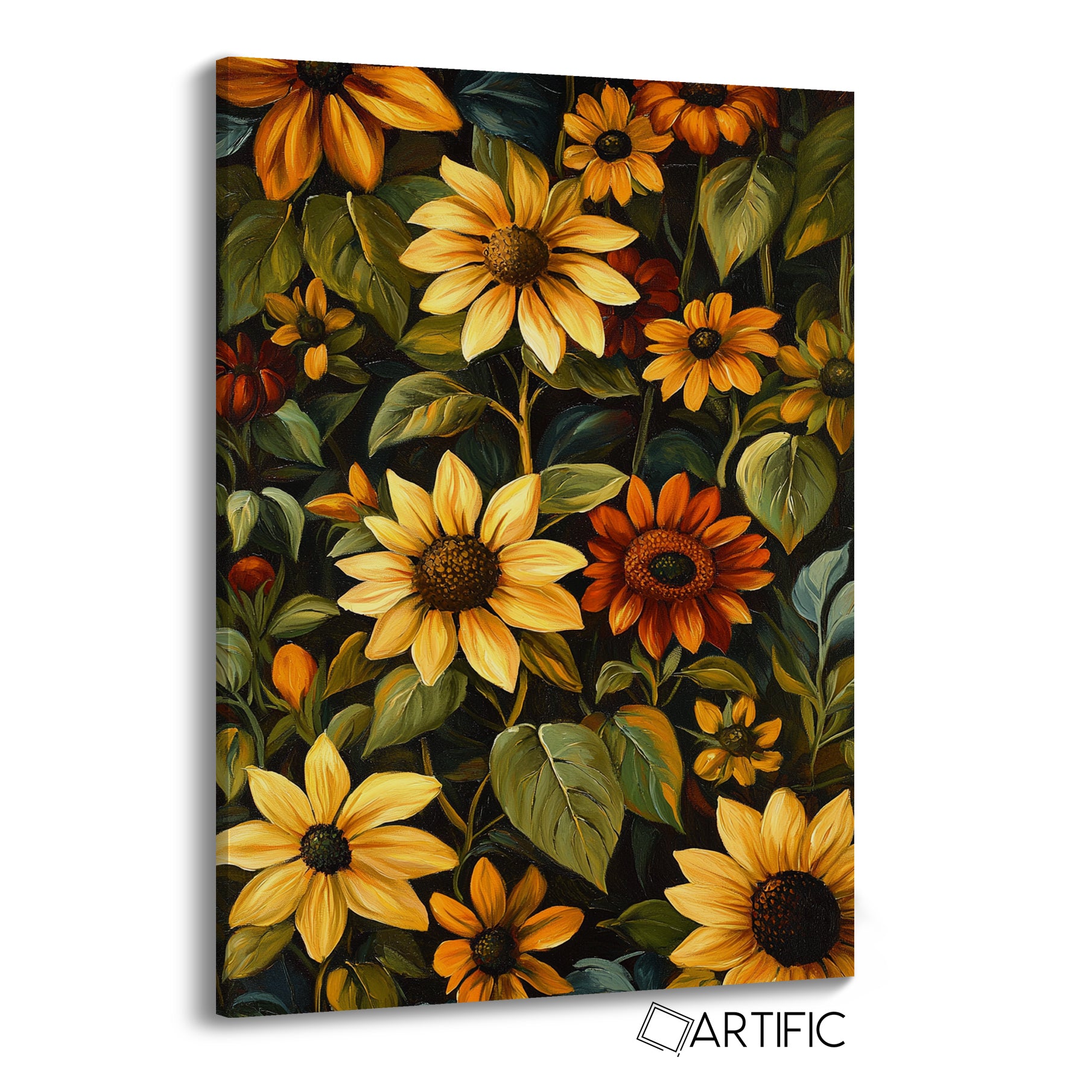 Esta obra de arte en óleo representa un conjunto de flores vibrantes, predominando los lirios de color dorado y amarillo sobre un fondo verde oscuro. Los colores cálidos y las texturas meticulosamente detalladas evocan una sensación de elegancia natural. Las hojas verde oscuro complementan la riqueza del amarillo y naranja, creando un contraste armonioso. Con sus pinceladas detalladas, esta composición captura la esencia de una naturaleza exuberante.