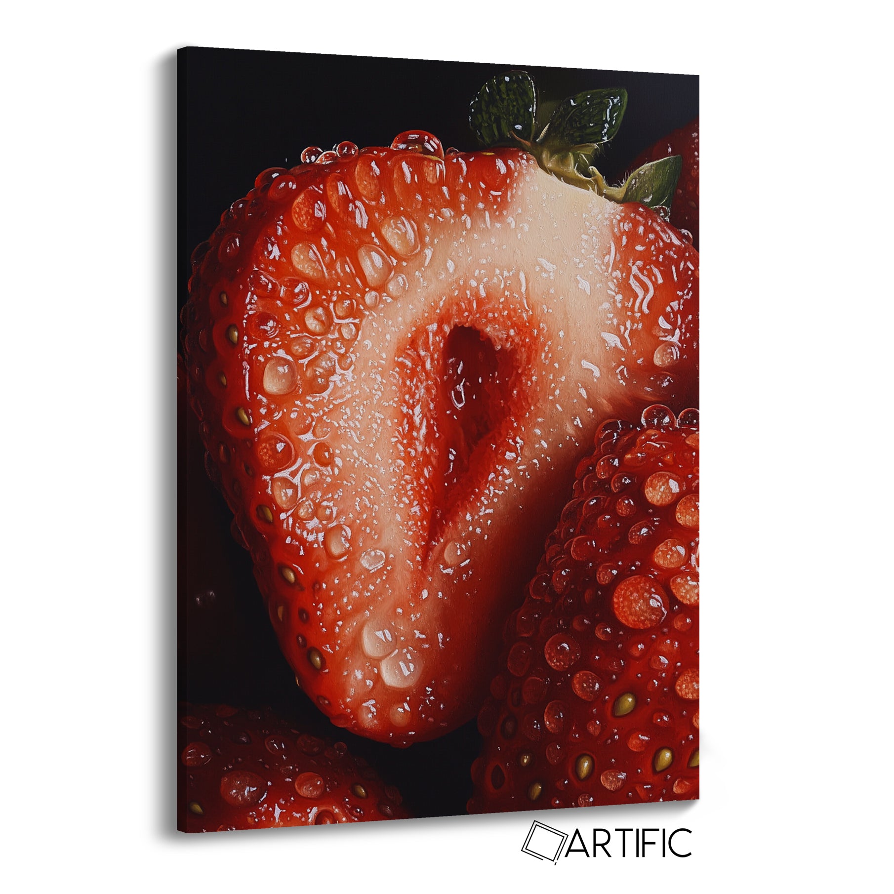 Esta imagen artística presenta un retrato impresionante de fresas en un estilo hiperrealista. Cada gota de agua sobre la superficie roja resalta su textura y frescura, mientras que los colores vibrantes y la iluminación meticulosa otorgan un realismo inigualable. La composición vertical resalta la elegancia y el detalle del fruto.