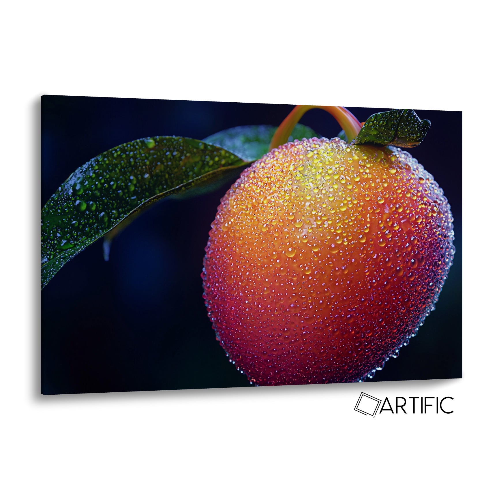 Una imagen impresionante de una fruta vibrante cubierta de pequeñas gotas de agua que realzan su superficie colorida y texturada. El color naranja de la fruta se complementa con hojas verdes en un fondo oscuro, creando un contraste elegante y llamativo. La imagen destaca por sus colores intensos y su suave iluminación, evocando la frescura de una mañana rocosa.