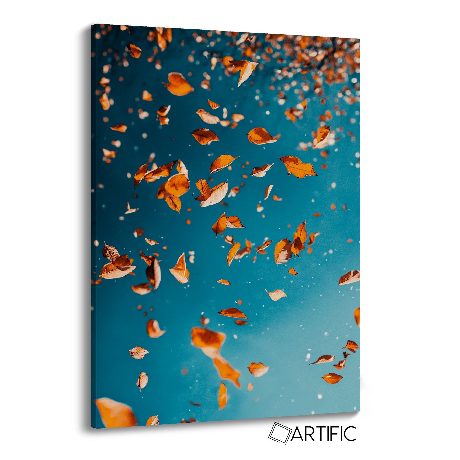 Una escena encantadora donde hojas otoñales en tonos naranjas flotan contra un cielo azul vibrante. La disposición y el movimiento capturan la esencia de un paisaje efímero, combinando elegancia y dinamismo en una composición vertical. La textura suave de las hojas y el contraste de colores crean una atmósfera increíblemente atractiva.