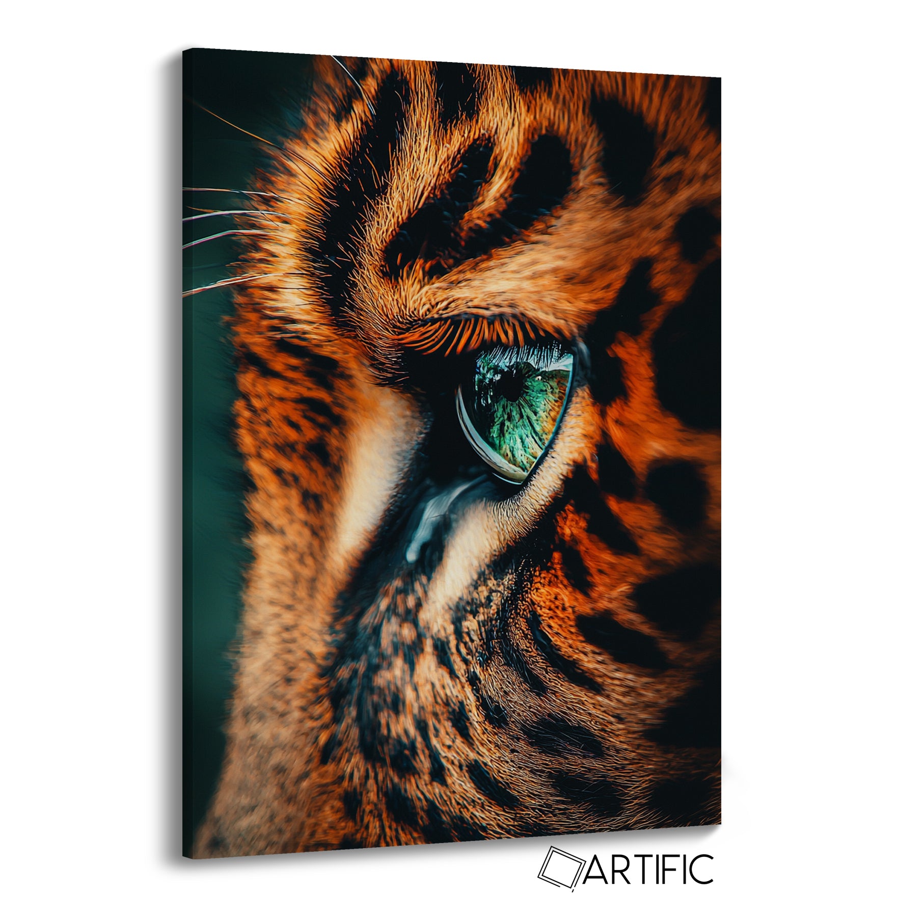 Esta imagen captura la intensidad y elegancia de un felino en un estilo cercano al hiperrealismo. Destaca por sus vibrantes tonos naranjas y negros, y el foco en el ojo verde esmeralda que brilla con una profundidad impresionante. La composición horizontal enfatiza la textura y las características del pelaje, resaltando la esencia majestuosa del animal.