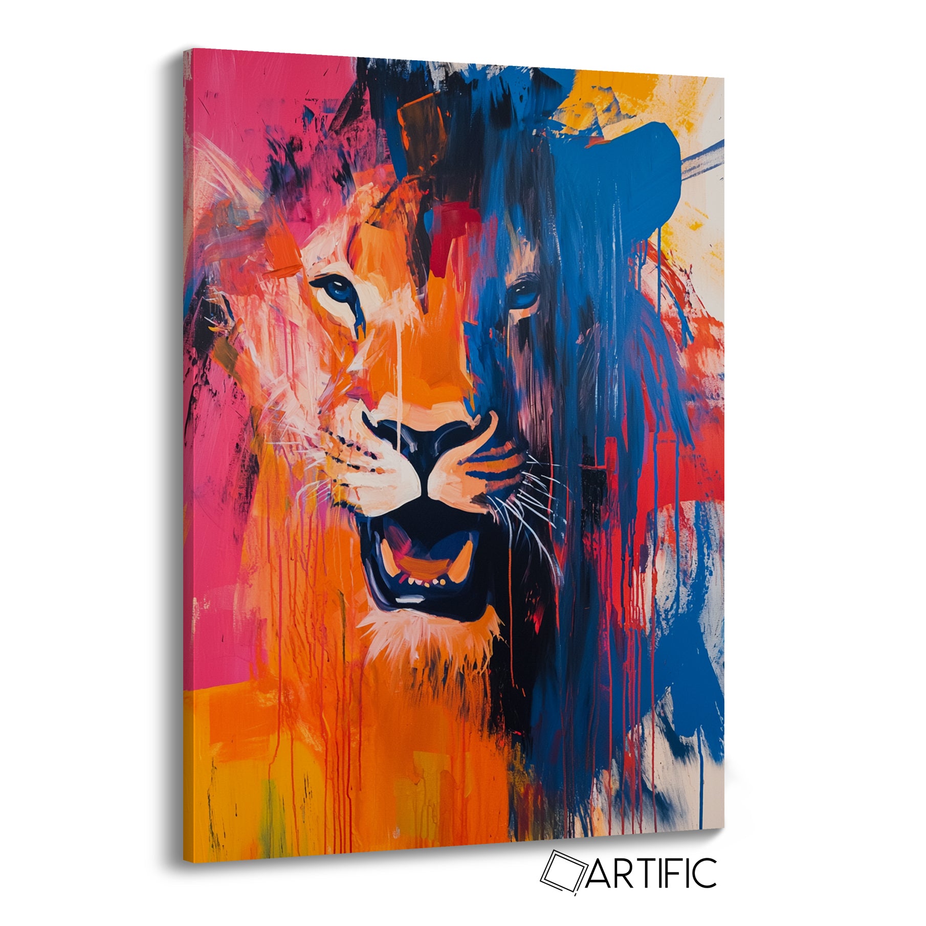 Esta obra de arte presenta un león admirablemente retratado en estilo abstracto. La pintura combina colores vibrantes como el naranja, azul, rosa y amarillo, creando un dinamismo visual impresionante. Las pinceladas son audaces y fluidas, destacando la textura y el movimiento en la composición vertical. Este poderoso retrato del rey de la selva captura su esencia con un toque moderno y artístico.