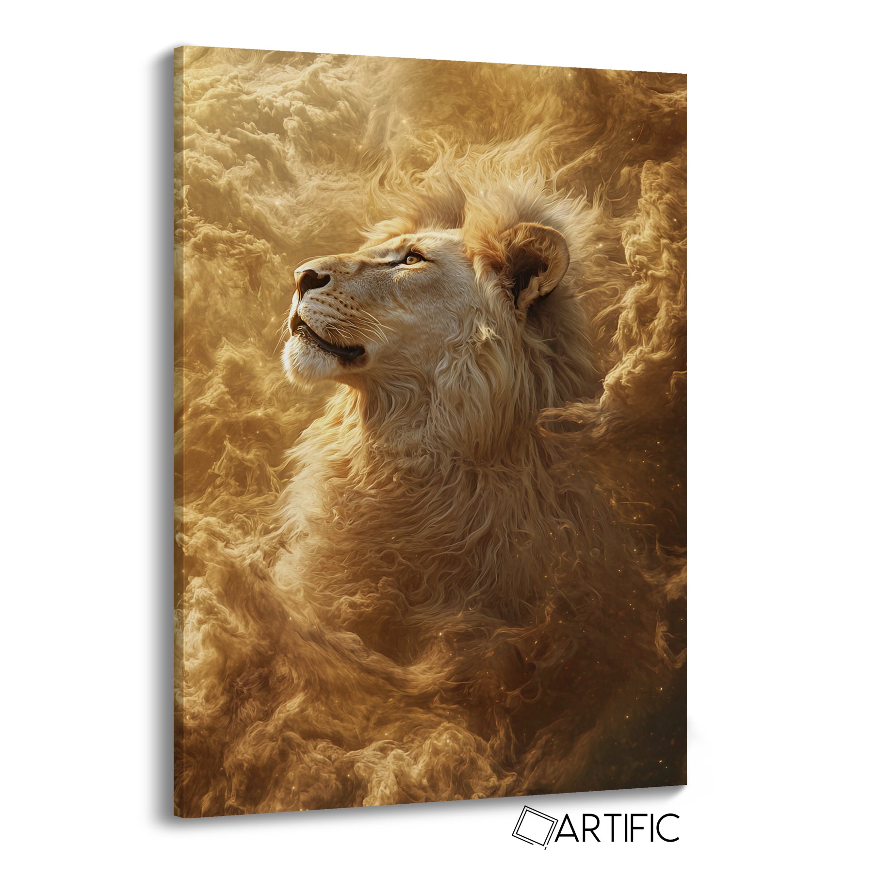 Esta imagen evoca una majestuosa fusión entre la figura noble de un león y la fluidez etérea de nubes doradas. Con una paleta de tonos cálidos y dorados, el león se presenta en un perfil elegante, rodeado de remolinos de nubes que parecen fundirse con su melena, dando una sensación de movimiento y poder. El estilo recuerda a una pintura al óleo impresionante en detalle y textura, capturando la elegancia innata del rey de la selva en una composición vertical que destaca por su armonía y magnificencia.