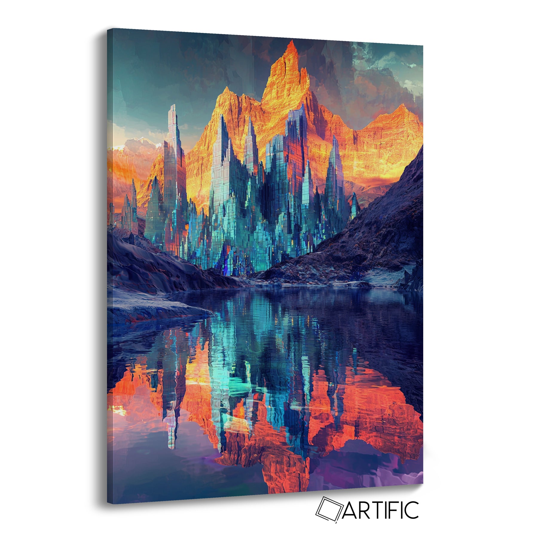 Una impresionante imagen de un paisaje surrealista donde montañas de cristal reflejan vibrantes colores al atardecer. Las formas geométricas y texturas abstractas crean una atmósfera mágica, mientras los tonos azules y naranjas se mezclan armoniosamente en el cielo y el reflejo en el agua. Esta composición vertical captura la majestuosidad de la naturaleza con un toque de fantasía artística.
