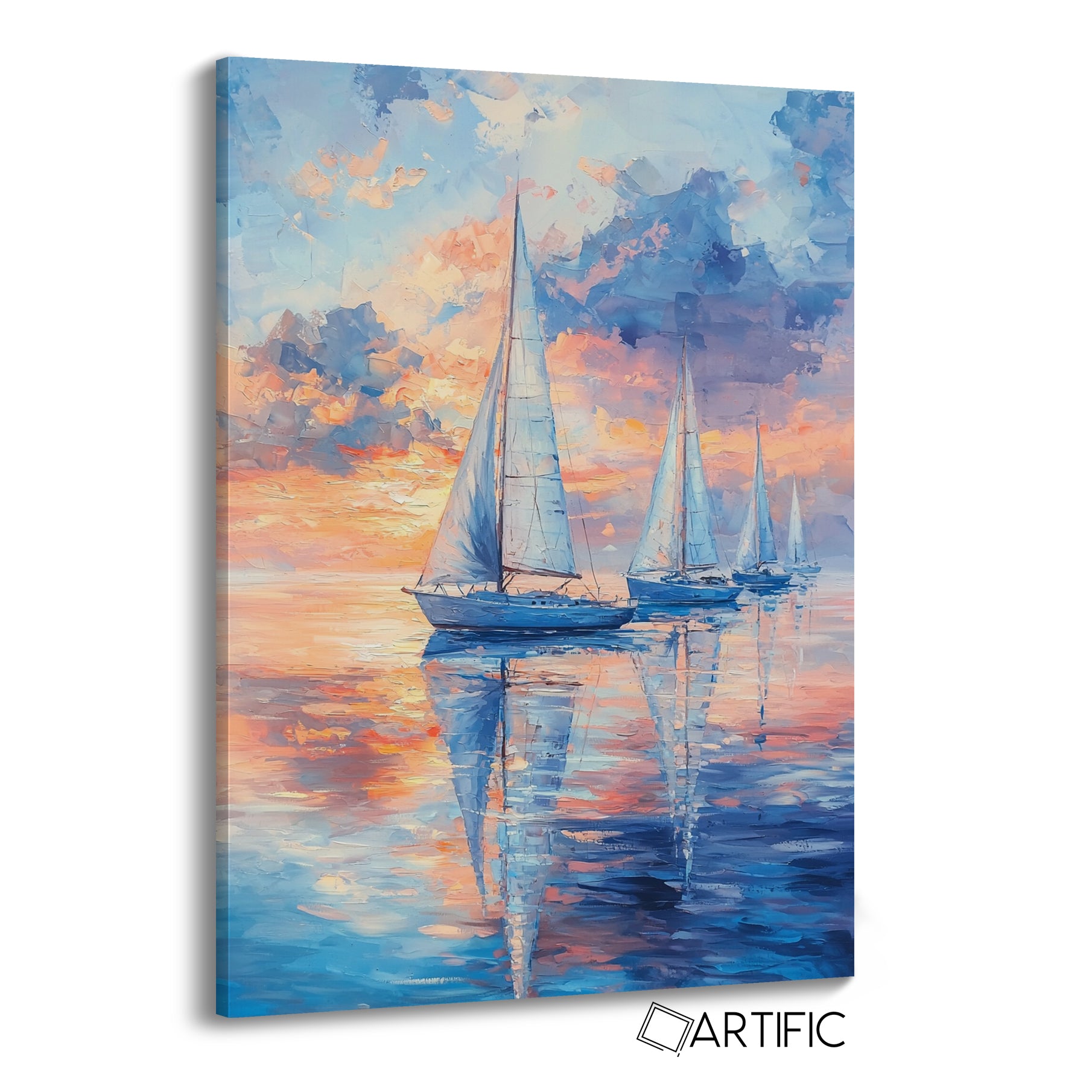 Esta obra de arte al óleo presenta un majestuoso amanecer en el mar, donde varias embarcaciones navegan en calma bajo un cielo vibrante. La composición vertical captura la elegancia de las velas reflejadas en el agua, con colores cálidos de naranja y rosa entrelazados con azules y morados suaves, evocando un sentimiento de serenidad y libertad.
