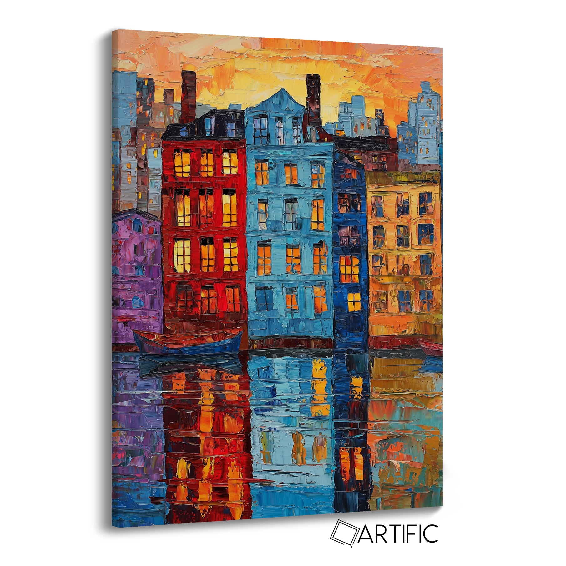 Esta obra maestra al óleo captura una vibrante escena urbana al anochecer. Las fachadas de los edificios están pintadas en tonos vivos de rojo, azul, y amarillo, reflejándose en las aguas tranquilas. El cielo arde con tonalidades cálidas de naranja y rosa, sugiriendo un atardecer enérgico. La textura gruesa y rica de las pinceladas añade una dimensión táctil, llenando la imagen de vida y emoción.