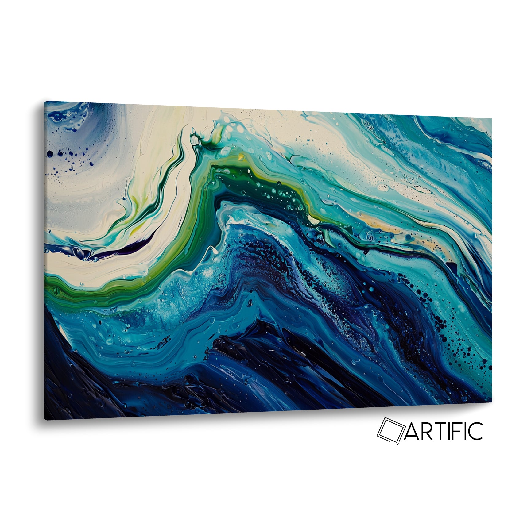 Esta obra de arte abstracta presenta un flujo dinámico de colores azules y verdes que evocan la imagen de olas en movimiento. Con su estilo artístico que se asemeja a una pintura al óleo moderna, la pieza resalta por sus vibrantes tonos y texturas fluidas que parecen capturar el movimiento del agua. Su composición armoniosa y el elegante uso de los contrastes hacen de esta pieza una adición fascinante a cualquier espacio.
