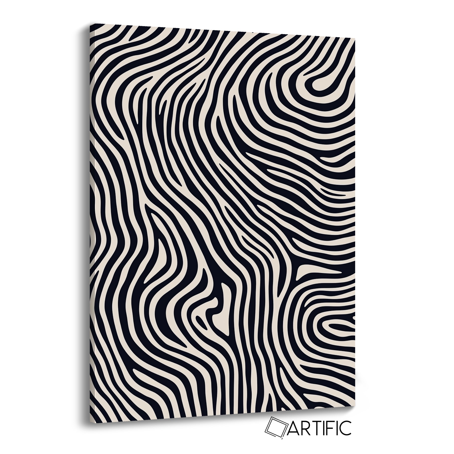 Esta imagen presenta un diseño abstracto que simula ondas en movimiento, dominado por colores blanco y negro. Las formas ondulantes crean un efecto hipnótico y de flujo continuo. La composición es limpia, con un estilo contemporáneo que transmite elegancia a través de sus líneas fluidas y contraste de colores.