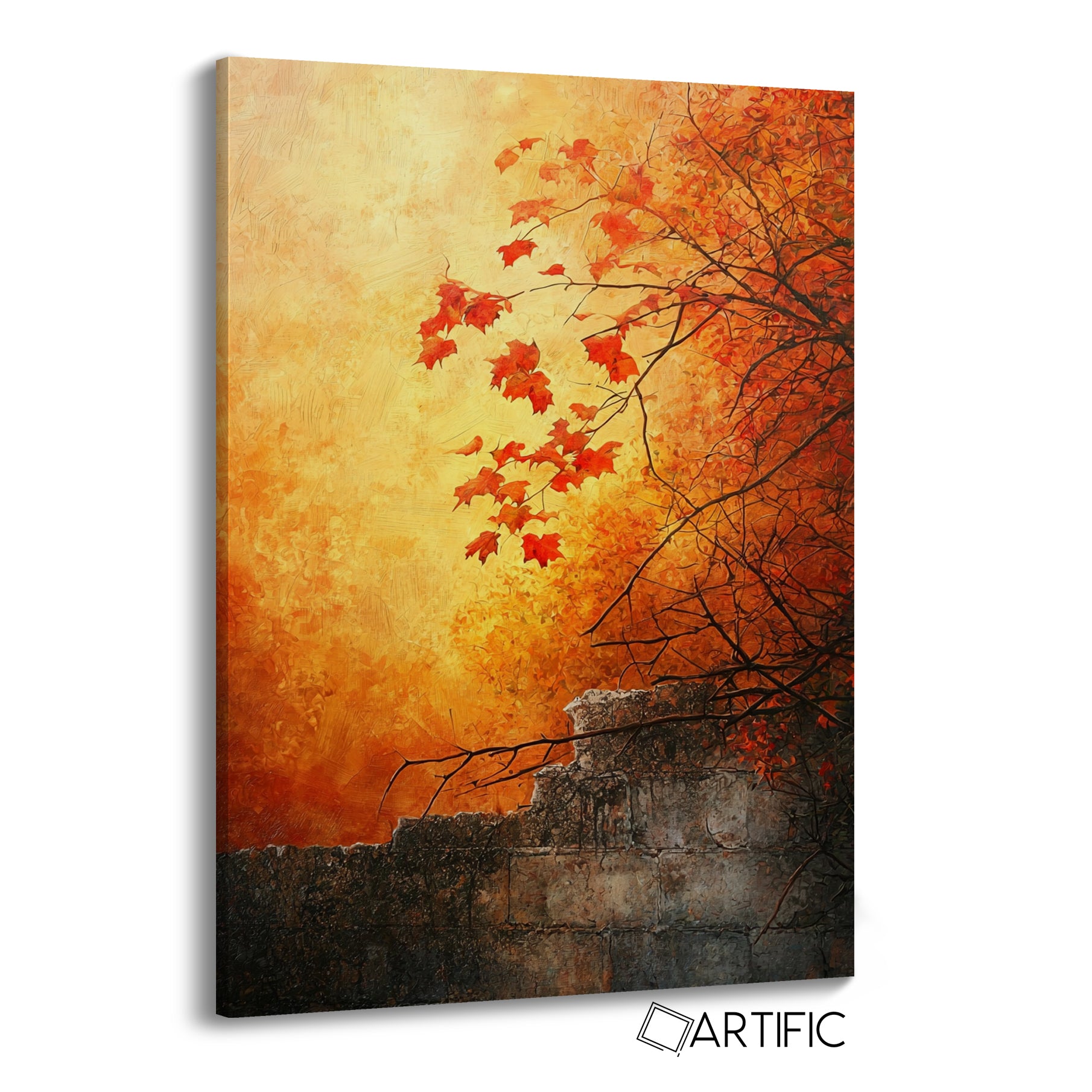 Esta obra de arte refleja un estilo de pintura al óleo con tonos cálidos que evocan la esencia del otoño. La imagen presenta una pared de piedra en la parte inferior, sobre la cual se extienden ramas de un árbol con hojas vibrantes de color rojo y naranja. El fondo se ilumina con un tono dorado suave, sugiriendo un atardecer otoñal. La textura rica y las formas fluidas capturan la elegancia de la estación, mientras que la composición vertical dirige la atención hacia la belleza etérea del paisaje.