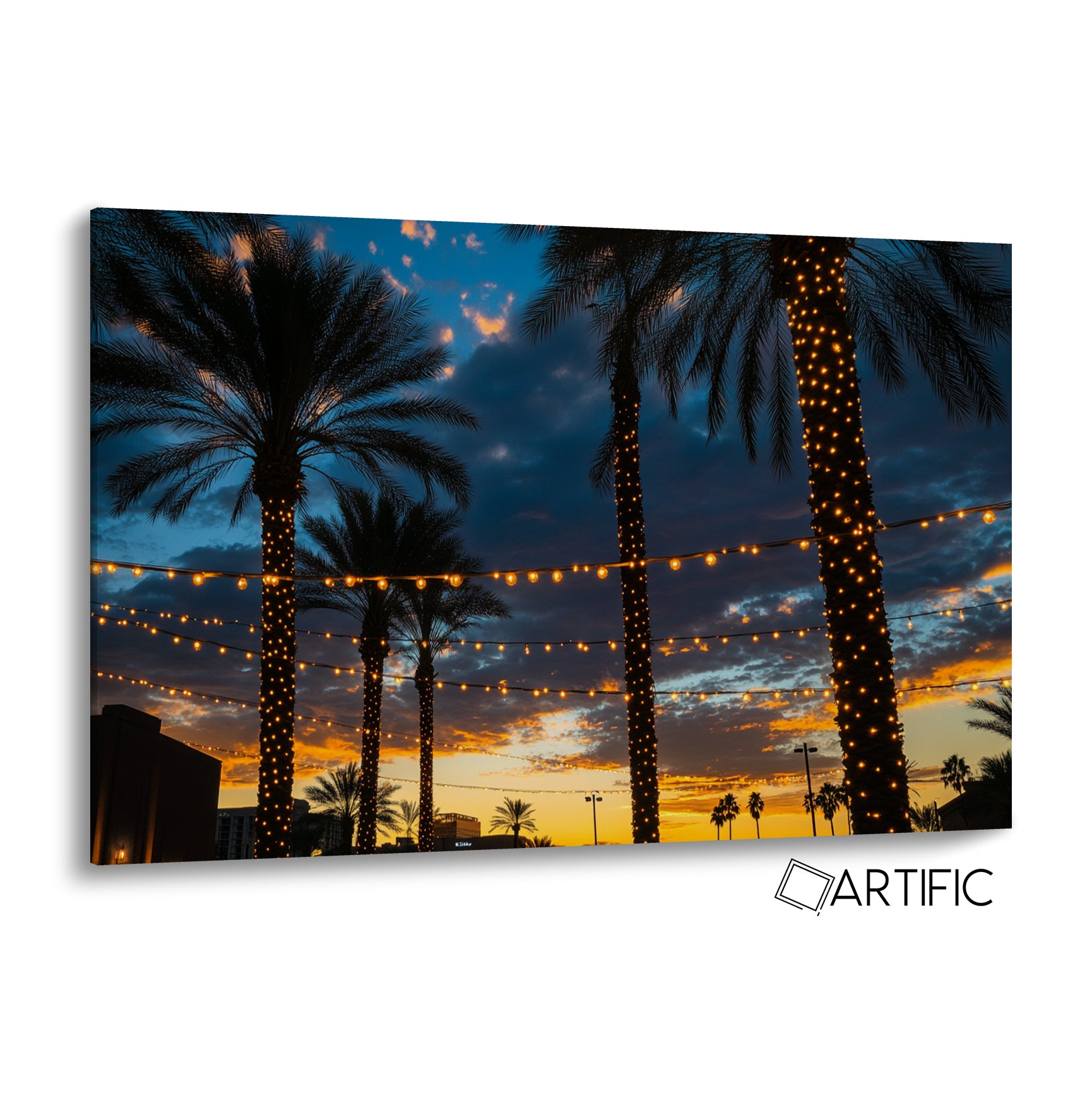 Una escena cautivadora de palmeras altas y majestuosas adornadas con luces brillantes que contrastan con un impactante atardecer. El cielo se muestra en vibrantes tonos de azul y naranja, mientras las nubes añaden textura y profundidad. Las luces amarillas envueltas alrededor de los troncos de las palmeras crean una atmósfera encantadora y festividad, resaltando la belleza natural del paisaje urbano.