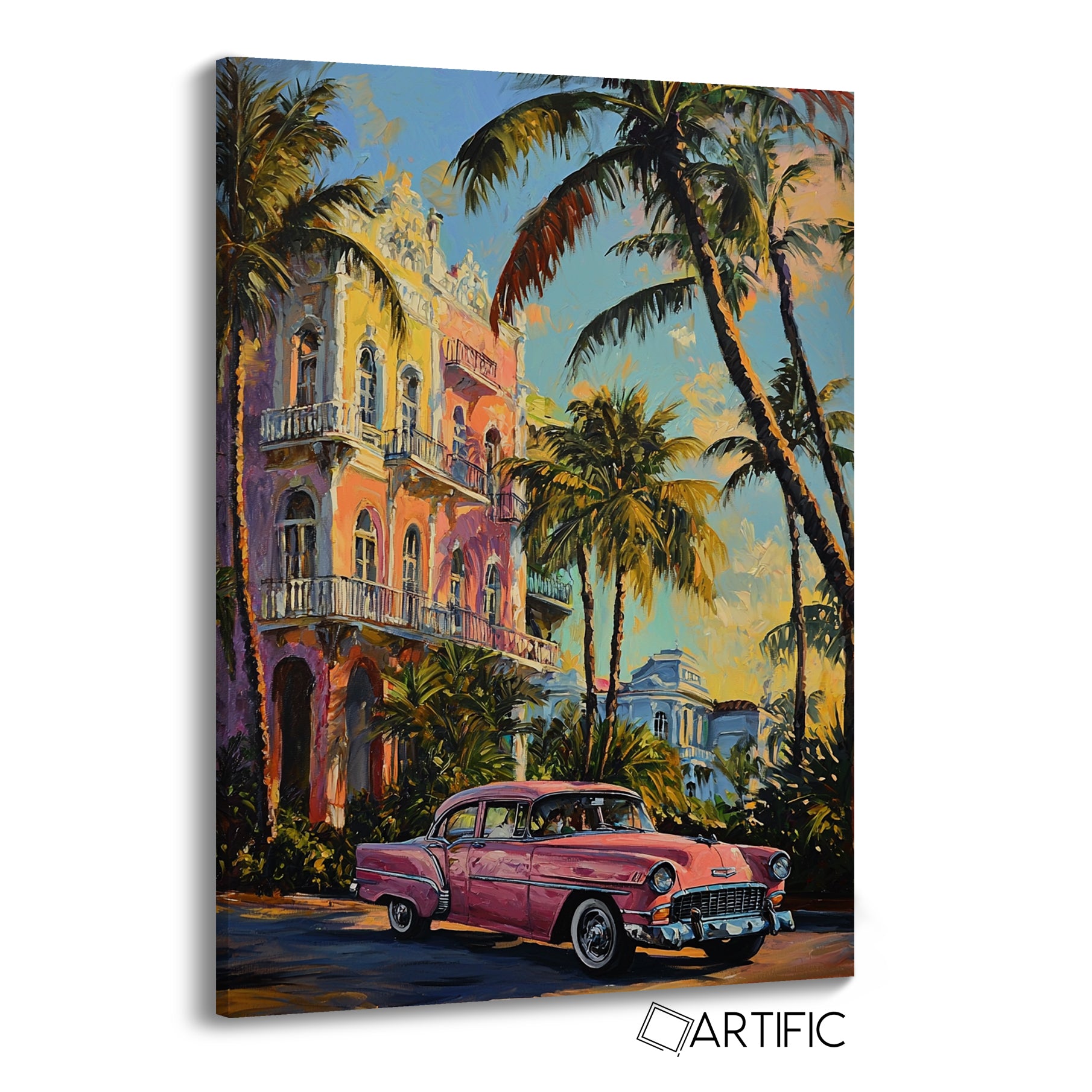 Esta pintura al óleo captura una elegante escena tropical con una arquitectura colonial de colores vibrantes. Dominan los tonos rosados y amarillos cálidos del edificio y el clásico automóvil rosado, mientras las palmeras se mecen suavemente bajo un cielo despejado. El arte transmite una atmósfera nostálgica y veraniega, combinando elementos de un pasado glamuroso con un entorno paradisíaco.