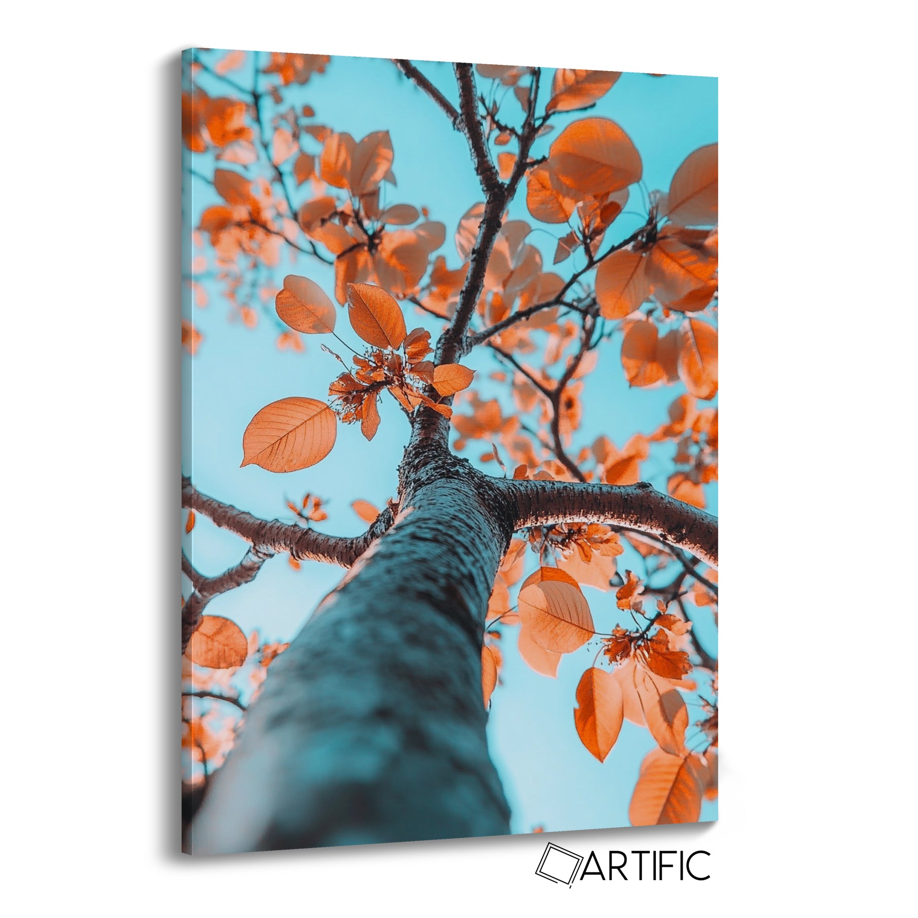 Una imagen cautivadora que ofrece una perspectiva única desde la base del tronco de un árbol que se eleva hacia el cielo. Las hojas de tono anaranjado contrastan maravillosamente con el azul vibrante del cielo, creando una composición visual cálida y acogedora. La textura rugosa del tronco aporta profundidad, mientras que las hojas suavemente desenfocadas transmiten una sensación de movimiento y vida. Este estilo recuerda el arte fotográfico abstracto con un enfoque en los colores vibrantes y el juego de perspectivas.