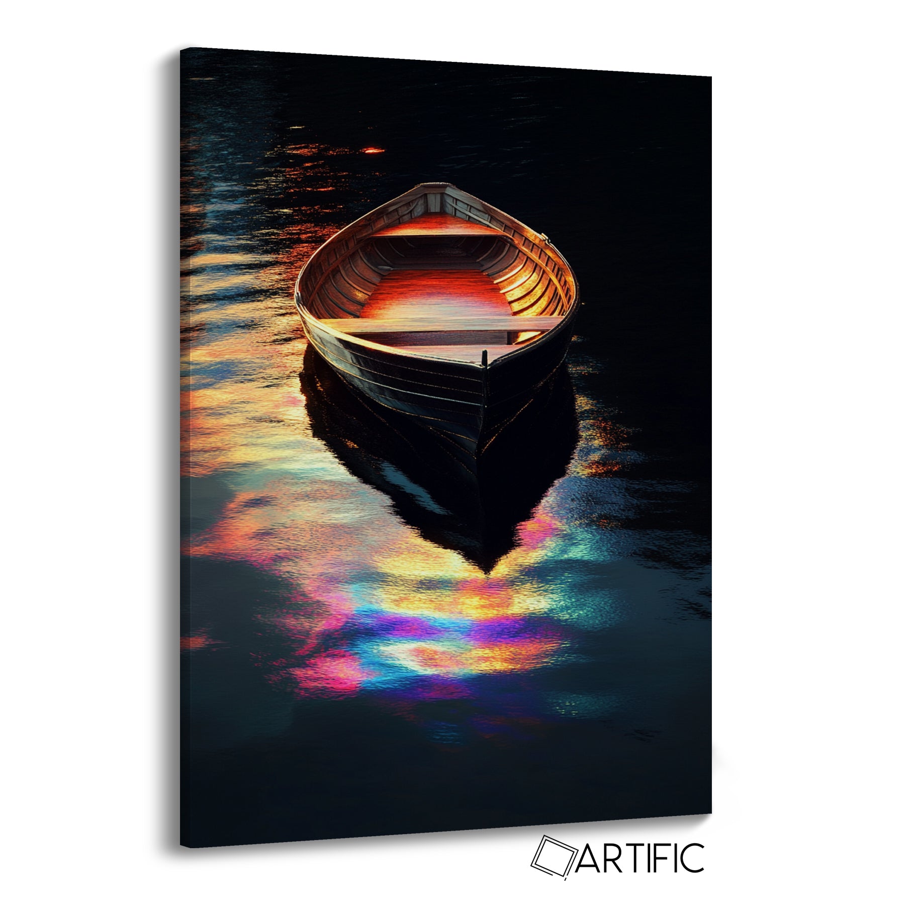 Esta imagen cautivadora presenta una barca iluminada flotando serenamente en aguas oscuras. El reflejo de colores vibrantes del arcoíris en el agua añade una dimensión de gran belleza y misterio. La composición artística destaca por su elegancia, capturando la esencia de la tranquilidad con un juego de luces brillantemente ejecutado similar a una pintura al óleo moderna.