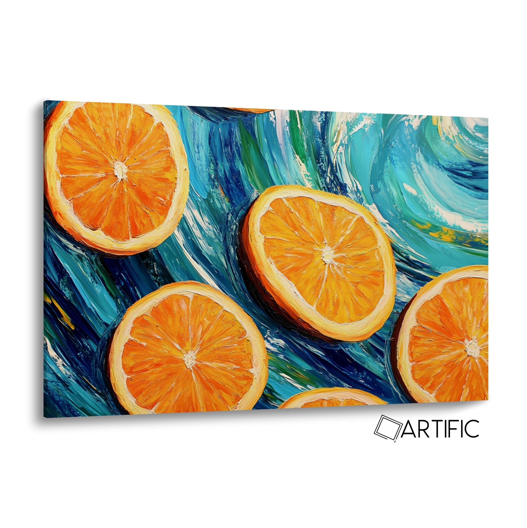 Esta llamativa obra de arte presenta rodajas de naranja vibrantes flotando sobre un fondo azul que evoca un torbellino marino. El estilo artístico se asemeja a una pintura al óleo, con texturas gruesas y colores vivos que capturan la esencia de un día soleado. Las pinceladas dinámicas en tonos azules y verdes crean un movimiento fluido, contrastando perfectamente con los tonos cálidos de las naranjas. La composición es horizontal, proporcionando una sensación de espacio y energía.