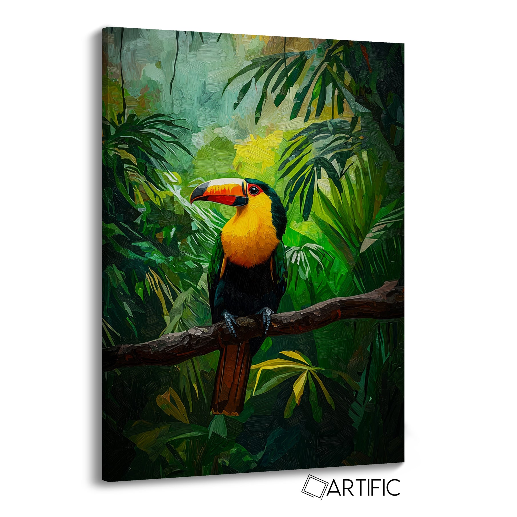 Esta obra presenta un tucán posado con elegancia sobre una rama en medio de una selva tropical vibrante. La imagen, que se asemeja a una pintura al óleo, incorpora un colorido plumaje amarillo y negro del tucán que resalta contra el fondo de frondosas hojas verdes. La composición artística captura la esencia exótica del entorno selvático con detalles texturizados y pinceladas visibles que aportan profundidad y movimiento a la obra.