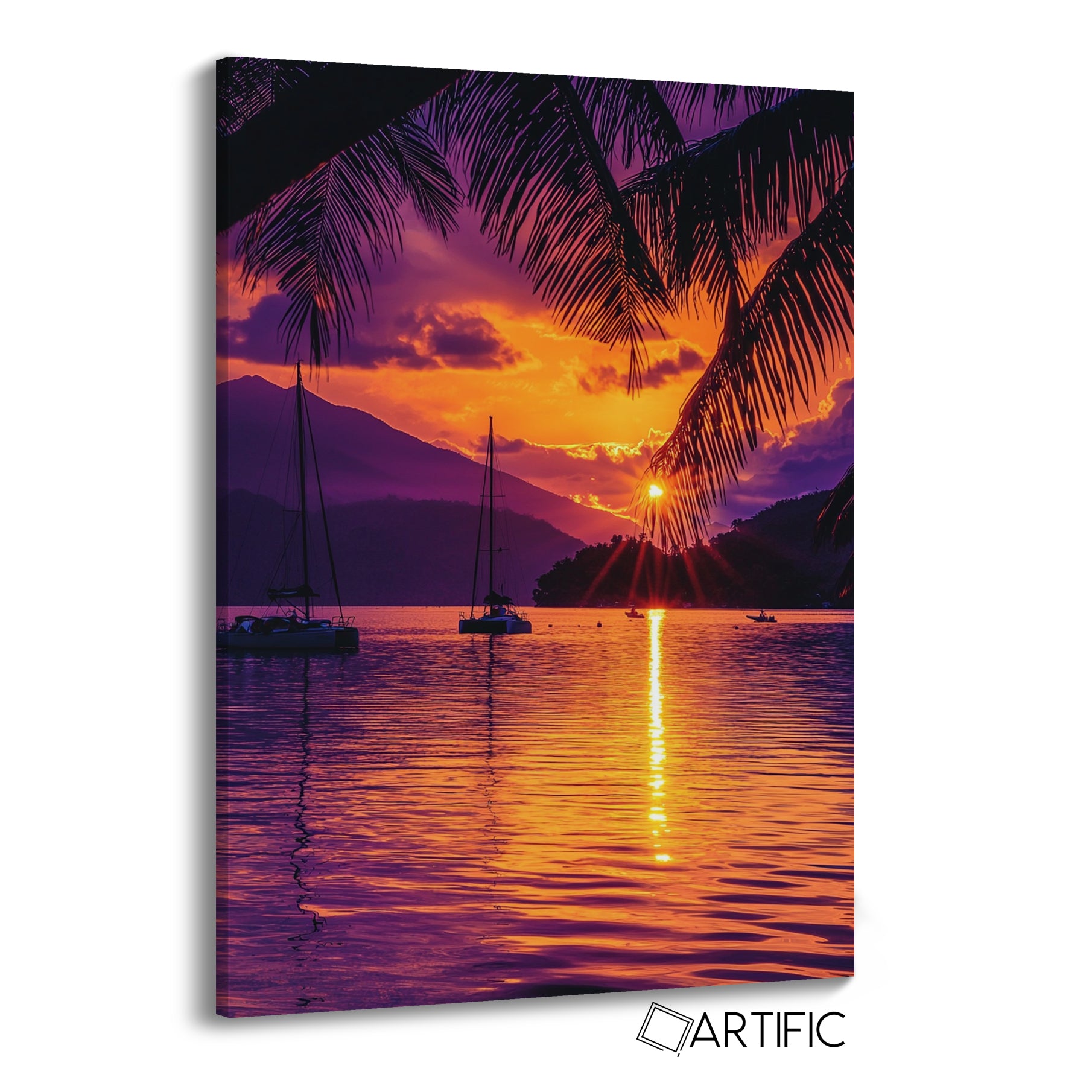 Una imagen impresionante de un atardecer tropical donde el cielo se pinta con tonos vibrantes de naranja, púrpura y magenta. Las siluetas de veleros descansan tranquilamente sobre un mar resplandeciente bajo las sombras de las palmeras. El reflejo del sol sobre el agua aporta una sensación de serenidad y elegancia inigualables.